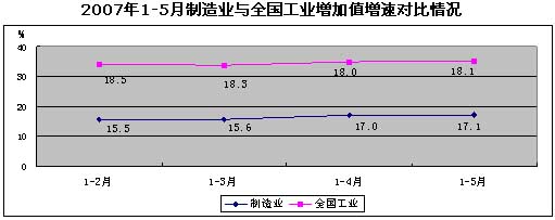 制造業(yè)發(fā)展速度有所放緩。今年自年初以來,制造業(yè)實現(xiàn)主營業(yè)務(wù)收入、增加值增速保持在15.5%-17.1%區(qū)間內(nèi)小幅震蕩,增速水平比去年同期增速低近15個百分點。制造業(yè)增加值增速連續(xù)低于全國工業(yè)增速水平,1-5月增加值增速低于全國工業(yè)增加值增速1.2個百分點(全國工業(yè)增速為18.1%)。