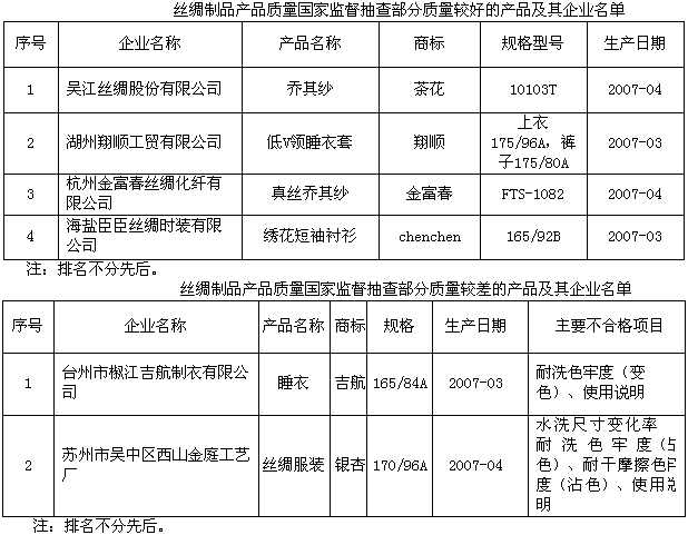 為維護消費者的合法權益,促進絲綢行業(yè)健康發(fā)展,國家質(zhì)檢總局組織對絲綢制品產(chǎn)品質(zhì)量進行了國家監(jiān)督抽查。共抽查了絲綢制品主產(chǎn)地浙江、江蘇、上海、廣東等4個省、直轄市49家企業(yè)生產(chǎn)的49種產(chǎn)品(不涉及出口),產(chǎn)品抽樣合格率為75.5%。