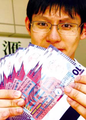 香港首批10港元面額的塑質鈔票9日面世,發(fā)行量為5000萬張。這款新鈔比舊鈔更耐用、更易保持干凈,而且符合環(huán)保要求。 圖為香港市民在匯豐銀行前,展示剛兌換的新10元塑質鈔票。