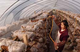 一名農(nóng)民正在溫室大棚內(nèi)給食用菌施肥。 | 國家戰(zhàn)略:打造中西部首家綜合配套改革試驗區(qū)
