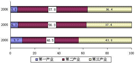 三次產(chǎn)業(yè)比例為5.8:57.8:36.4。與上年相比,第二產(chǎn)業(yè)比重提高1.5個百分點,其中工業(yè)增加值占生產(chǎn)總值的比重達到52.3%,提高1.6個百分點。