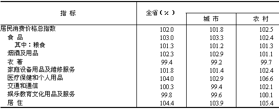 市場物價溫和上漲。居民消費價格總水平比上年上漲2.0%,其中城市上漲1.8%,農(nóng)村上漲2.5%。商品零售價格指數(shù)上漲1.2%。農(nóng)業(yè)生產(chǎn)資料價格指數(shù)上漲3.6%。工業(yè)品出廠價格指數(shù)上漲1.0%。原材料、燃料、動力購進價格指數(shù)上漲2.6%。固定資產(chǎn)投資價格指數(shù)上漲1.5%。土地交易價格指數(shù)上漲5.0%。房屋銷售價格指數(shù)上漲4.3%,房屋租賃及物業(yè)管理價格指數(shù)分別上漲3.1%和0.9%。農(nóng)產(chǎn)品生產(chǎn)價格指數(shù)上漲0.2%,其中,谷物上漲1.5%,棉花下降2.5%,油料上漲6.1%,畜產(chǎn)品下降1.3%。
