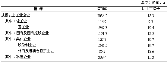 工業(yè)生產(chǎn)較快增長,產(chǎn)銷銜接良好。全年全省完成全部工業(yè)增加值2482.7億元,比上年增長16.0%。其中規(guī)模以上工業(yè)增加值2086.2億元,增長18.3%;產(chǎn)品銷售率97.6%。
