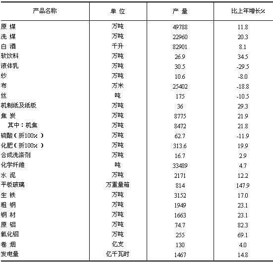 (全社會產(chǎn)量5.8億噸,增長7.1%),洗煤增長20.3%,焦炭增長21.9%,生鐵增長17.0%,粗鋼增長23.1%,鋼材增長23.1%,原鋁增長82.3%,氧化鋁增長69.1%,發(fā)電量增長14.8%。