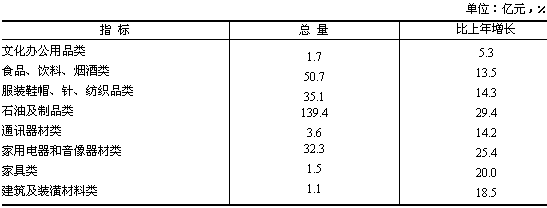 消費品市場銷售穩(wěn)中趨旺。全年全省實現(xiàn)社會消費品零售總額1613.4億元,比上年增長15.2%,扣除價格上漲因素,實際增長13.8%。其中城市消費品零售額1048.6億元,增長16.2%,縣的消費品零售額297.8億元,增長13.5%,縣以下消費品零售額267.1億元,增長13.1%。分行業(yè)看,批發(fā)零售業(yè)零售額1363.2億元,增長14.8%;住宿和餐飲業(yè)零售額196.3億元,增長20.2%;其他行業(yè)零售額53.9億元,增長6.8%。