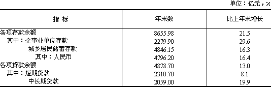 財政收入繼續(xù)強勢增長。全年全省完成財政總收入1048.0億元,一般預算收入583.1億元,分別比上年增長38.2%和58.3%?鄢Y源探礦權(quán)、采礦權(quán)收入,財政總收入和一般預算收入分別為887.3億元和422.4億元,同口徑增長20.3%和21.4%。增值稅、營業(yè)稅、資源稅、企業(yè)所得稅和個人所得稅五大稅種共計完成稅收281.8億元,分別增長15.7%、22.7%、12.3%、41.7%和14.8%,增收49.6億元,占到財政總收入增量的33.2%。 財政支出結(jié)構(gòu)進一步優(yōu)化。一般預算支出執(zhí)行912.0億元,比上年增長36.4%。其中基本建設(shè)支出增長7.9%,水利和氣象支出增長17.3%,科學支出增長18.0%,教育支出增長17.7%,醫(yī)療衛(wèi)生支出增長25.0%,撫恤和社會福利救濟費支出增長22.7%,城市居民最低生活保障支出增長17.8%,公檢法司支出增長23.4%,文體廣播事業(yè)費增長21.7%。 年末全省金融機構(gòu)本外幣各項存款余額8656.0億元,比年初增加1529.3億元,與上年相比,多增338.4億元,增長21.5%,增幅同比提高1.5個百分點。各項貸款余額4878.7億元,比年初增加564.3億元,比上年多增297.6億元,增長13.0%,增幅同比提高2.6個百分點。人民幣個人消費貸款171.2億元,下降27.9%,其中個人住房貸款106.7億元,下降28.4%。全年累計現(xiàn)金收入17964.3億元,累計現(xiàn)金支出18087.6億元,貨幣凈投放123.3億元,比上年多投放91.4億元。