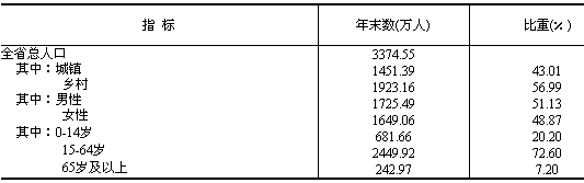 據(jù)2006年人口抽樣調(diào)查,年末全省總?cè)丝跒?374.6萬人,比上年末增加19.3萬人。全年全省出生人口38.6萬人,出生率為11.48‰;死亡人口19.3萬人,死亡率為5.73‰;人口自然增長率為5.75‰。