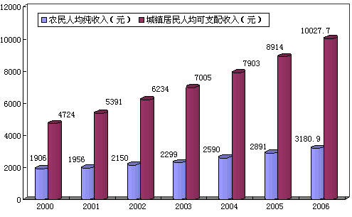 城鄉(xiāng)居民收入較快增長。全年城鎮(zhèn)居民人均可支配收入突破萬元大關(guān),達到10027.7元,比上年增長12.5%,扣除價格上漲因素,實際增長10.5%;城鎮(zhèn)居民人均消費性支出7170.9元,增長13.1%。農(nóng)村居民人均純收入邁上3000元臺階,達到3180.9元,增長10.0%,實際增長7.6%;農(nóng)民人均生活消費支出2253.3元,增長20.0%。城市居民家庭恩格爾系數(shù)(即居民家庭食品消費支出占家庭消費支出的比重)31.4%,農(nóng)村居民家庭恩格爾系數(shù)38.5%。城鎮(zhèn)占人口20%的低收入者收入4213.4元,增長12.9%;農(nóng)村占人口20%的低收入者收入1194.4元,增長10.1%!
