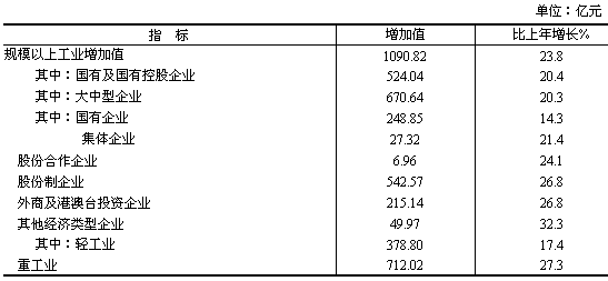 全年全部工業(yè)增加值1595.83億元,比上年增長20.1%。規(guī)模以上工業(yè)增加值1090.82億元,增長23.8%;產(chǎn)品銷售率96.2%;工業(yè)新產(chǎn)品產(chǎn)值377.21億元,增長31.4%;工業(yè)品出口交貨值195.06億元,增長34.8%。