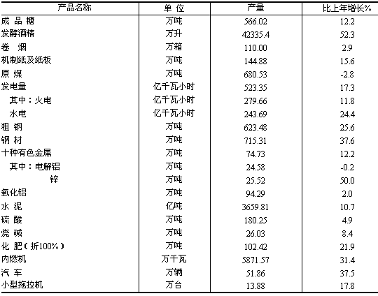 從主要行業(yè)看,黑色金屬冶煉及壓延加工業(yè)增加值105.14億元,增長36.8%;電力、熱力生產(chǎn)和供應(yīng)業(yè)增加值133.57億元,增長21.1%;交通運(yùn)輸設(shè)備制造業(yè)增加值90.00億元,增長24.0%;有色金屬冶煉及壓延加工業(yè)增加值92.14億元,增長25.1%;非金屬礦物制品業(yè)增加值58.05億元,增長41.5%;化學(xué)原料及化學(xué)制品制造業(yè)增加值71.72億元,增長34.6%;農(nóng)副食品加工業(yè)增加值157.43億元,增長15.5%。 發(fā)電量523.35億千瓦小時,比上年增長17.3%;鋼材產(chǎn)量715.31萬噸,增長37.6%;內(nèi)燃機(jī)5871.57萬千瓦,增長31.4%;汽車產(chǎn)量51.86萬輛,增長37.5%;水泥產(chǎn)量3659.81萬噸,增長10.7%;成品糖產(chǎn)量566.02萬噸,增長12.2%。