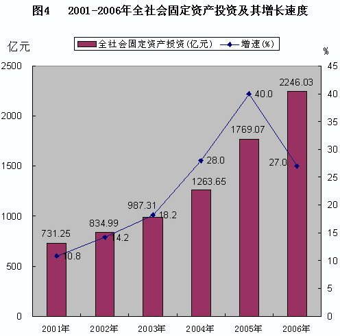 全年全社會固定資產(chǎn)投資2246.03億元,比上年增長27%。其中,城鎮(zhèn)固定資產(chǎn)投資1995.13億元,增長31.1%;農(nóng)村固定資產(chǎn)投資250.91億元,增長1.7%。在城鎮(zhèn)固定資產(chǎn)投資中,基本建設(shè)投資1170.11億元,增長29.9%;更新改造投資372.28億元,增長35.5%;其他投資82.76億元,增長38.0%;房地產(chǎn)開發(fā)投資369.98億元,增長29.0%。