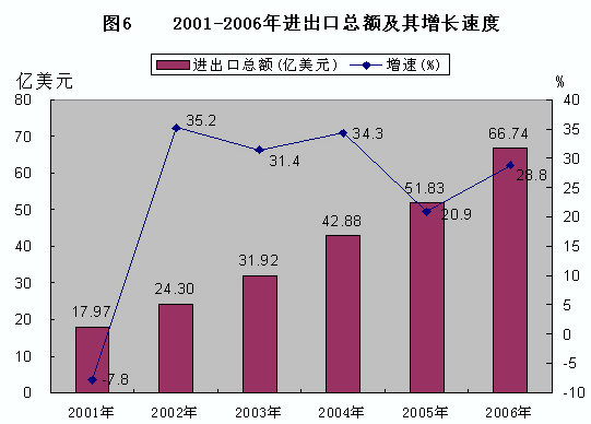 中國與東盟建立對話關(guān)系15周年紀(jì)念峰會和第三屆中國-東盟博覽會、中國-東盟商務(wù)與投資峰會圓滿成功舉辦。北部灣(廣西)經(jīng)濟(jì)區(qū)開放開發(fā)全面啟動,泛北部灣經(jīng)濟(jì)合作有效推動。第二屆桂臺經(jīng)貿(mào)交流會和首屆兩岸共同產(chǎn)業(yè)市場論壇成功舉辦。我區(qū)與東盟各國、港澳臺及各省區(qū)市的經(jīng)貿(mào)合作進(jìn)一步深化。全年區(qū)外境內(nèi)到位資金615.42億元,增長48.5%。實(shí)際利用外資7.11億美元,增長11.4%,其中直接利用外資4.47億美元,增長18.2%。 全年對外承包工程和勞務(wù)合作完成營業(yè)額0.53億美元,比上年增長1.1倍。