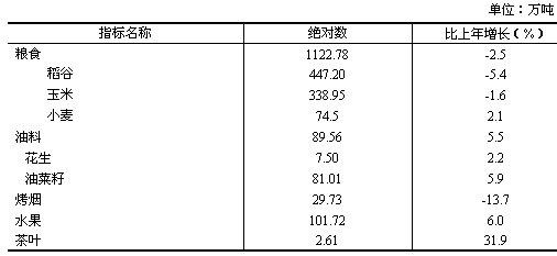 農(nóng)業(yè)生產(chǎn)形勢(shì)基本穩(wěn)定。2006年,全省種植業(yè)實(shí)現(xiàn)增加值228.41億元,比上年增長1.3%。糧食種植面積達(dá)到310.85萬公頃(4662.75萬畝),比上年增長1.1%?緹煼N植面積17.8萬公頃(267萬畝),因計(jì)劃調(diào)減比上年下降13.8%;油料種植面積56.38萬公頃(845.7萬畝),比上年增長1.6%;蔬菜種植面積49.45萬公頃(741.75萬畝),比上年增長4.5%。年末果園面積119143公頃(178.71萬畝),比上年增長0.2%;年末茶園面積63596公頃(95.39萬畝),比上年增長6.5%。受部分地區(qū)嚴(yán)重干旱影響,糧食總產(chǎn)量1122.78萬噸,比上年下降2.5%;油料作物產(chǎn)量89.56萬噸,比上年增長5.5%,創(chuàng)我省油料作物產(chǎn)量歷史新高。烤煙產(chǎn)量29.73萬噸,比上年下降13.7%。