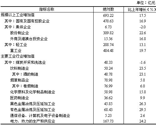 2006年,主要生產(chǎn)要素供求緊張狀況明顯改善,工業(yè)在優(yōu)勢(shì)產(chǎn)業(yè)帶動(dòng)下實(shí)現(xiàn)快速發(fā)展。全省工業(yè)增加值完成857.17億元,比上年增長15.0%。其中,全部國有及年產(chǎn)品銷售收入在500萬元及以上非國有工業(yè)企業(yè)(以下簡稱規(guī)模以上工業(yè)企業(yè))實(shí)現(xiàn)增加值693.22億元,比上年增長17.5%。