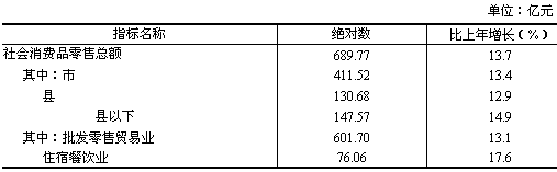 消費(fèi)品市場繼續(xù)保持穩(wěn)步發(fā)展的良好態(tài)勢(shì)。全省實(shí)現(xiàn)社會(huì)消費(fèi)品零售總額689.77億元,比上年增長13.7%。城鄉(xiāng)消費(fèi)品市場實(shí)現(xiàn)較快增長,其中,城市(市、縣)消費(fèi)品零售總額增長13.3%,農(nóng)村(縣以下)消費(fèi)品零售總額增長14.9%。住宿餐飲業(yè)增長17.6%,其中星級(jí)住宿業(yè)和限額以上餐飲業(yè)增長19.1%。