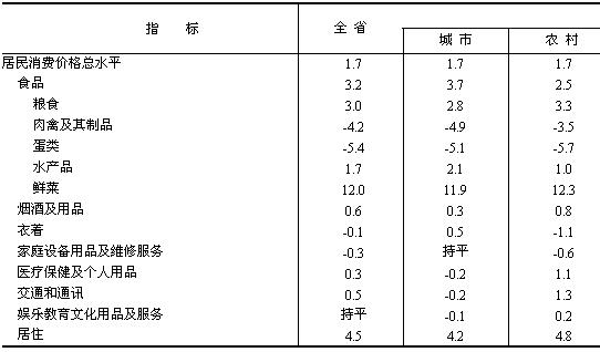 國民經(jīng)濟(jì)平穩(wěn)較快增長。初步核算,全省生產(chǎn)總值達(dá)到11613.7億元,比上年增長13.2%。其中,第一產(chǎn)業(yè)增加值1605.4億元,增長5.0%;第二產(chǎn)業(yè)增加值6071.3億元,增長15.0%;第三產(chǎn)業(yè)增加值3937億元,增長13.9%。三次產(chǎn)業(yè)結(jié)構(gòu)由上年的14.9:51.8:33.3調(diào)整為13.8:52.3:33.9。人均生產(chǎn)總值16894元,比上年增長12.4%。 物價(jià)總體保持平穩(wěn)。居民消費(fèi)價(jià)格總水平比上年上漲1.7%,其中城市和農(nóng)村均上漲1.7%。價(jià)格變動(dòng)結(jié)構(gòu)性特征明顯。食品類和居住類價(jià)格上漲幅度較大,漲幅分別為3.2%和4.5%,是拉動(dòng)居民消費(fèi)價(jià)格上漲的主要因素。工業(yè)品出廠價(jià)格上漲0.8%,原材料、燃料、動(dòng)力購進(jìn)價(jià)格上漲5.0%,漲幅比上年分別回落3.6和2.0個(gè)百分點(diǎn)。農(nóng)產(chǎn)品生產(chǎn)價(jià)格上漲0.2%。