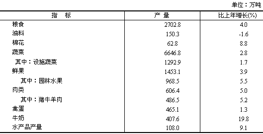 農(nóng)業(yè)生產(chǎn)形勢良好。糧食生產(chǎn)再獲豐收,全年糧食播種面積619.9萬公頃,比上年減少0.7%;糧食單產(chǎn)290.7公斤,創(chuàng)歷史新高;總產(chǎn)量2702.8萬噸,增長4.0%,是2000年以來最高水平。棉花生產(chǎn)出現(xiàn)較大轉(zhuǎn)機(jī),播種面積62.3萬公頃,比上年增長8.7%;總產(chǎn)量62.8萬噸,由2005年下降轉(zhuǎn)為增長8.8%。油料播種面積53.8萬公頃,減少3.8%;總產(chǎn)量150.3萬噸,下降1.6%。蔬菜播種面積112.3萬公頃,增長1.6%;總產(chǎn)量6646.8萬噸,增長2.8%。畜牧業(yè)生產(chǎn)保持平穩(wěn),肉類、禽蛋、牛奶產(chǎn)量分別達(dá)到606.4萬噸、465.1萬噸和407.6萬噸,分別增長5.0%、1.3%和19.8%。漁業(yè)生產(chǎn)發(fā)展較快,全年水產(chǎn)品產(chǎn)量達(dá)108.0萬噸,增長9.1%。