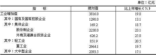 工業(yè)生產(chǎn)較快增長。全部工業(yè)增加值完成5453.4億元,增長16.0%。其中規(guī)模以上工業(yè)增加值3816.0億元,增長19.8%。產(chǎn)銷銜接良好,產(chǎn)銷率為98.2%,比上年提高0.4個(gè)百分點(diǎn)。