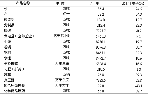 經(jīng)濟(jì)效益穩(wěn)步提高。全省規(guī)模以上工業(yè)實(shí)現(xiàn)利潤888.1億元,比上年增長30.4%。其中,國有及國有控股工業(yè)實(shí)現(xiàn)利潤253.0億元,增長16.6%;股份制企業(yè)實(shí)現(xiàn)利潤500.7億元,增長30.6%;外商及港澳臺(tái)投資企業(yè)實(shí)現(xiàn)利潤205.0億元,增長31.3%;私營企業(yè)實(shí)現(xiàn)利潤248.7億元,增長33.1%。多數(shù)行業(yè)盈利水平提高。在38個(gè)工業(yè)行業(yè)大類中,有33個(gè)行業(yè)利潤增長。其中黑色金屬冶煉及壓延加工業(yè)實(shí)現(xiàn)利潤254.8億元,石油和天然氣開采業(yè)實(shí)現(xiàn)利潤134.9億元,電力、蒸汽、熱水的生產(chǎn)和供應(yīng)業(yè)實(shí)現(xiàn)利潤70.3億元。 工業(yè)結(jié)構(gòu)進(jìn)一步調(diào)整優(yōu)化。積極運(yùn)用高新技術(shù)和先進(jìn)適用技術(shù)改造提升傳統(tǒng)產(chǎn)業(yè),主導(dǎo)產(chǎn)業(yè)得到強(qiáng)化,對工業(yè)生產(chǎn)的支撐作用強(qiáng)勁。鋼鐵、裝備制造、紡織服裝、建材建筑、食品、石油化工、醫(yī)藥等七大主導(dǎo)產(chǎn)業(yè)完成增加值3070.0億元,比上年增長21.6%;占規(guī)模以上工業(yè)增加值的80.5%,比上年提高2.1個(gè)百分點(diǎn),對工業(yè)生產(chǎn)增長的貢獻(xiàn)率達(dá)87.1%。產(chǎn)品結(jié)構(gòu)調(diào)整優(yōu)化,鋼材板帶比達(dá)53.9%,比上年提高6.4個(gè)百分點(diǎn);原材料、能源等優(yōu)勢產(chǎn)品增長較快,鋼材產(chǎn)量增長32.3%,平板玻璃增長16.6%;一批高附加值產(chǎn)品呈現(xiàn)快速增長,汽車產(chǎn)量增長39.3%,自動(dòng)化儀表及系統(tǒng)增長23.7%,光通信設(shè)備增長1.3倍,復(fù)印機(jī)械增長45.3%。高新技術(shù)產(chǎn)業(yè)保持較快增長,實(shí)現(xiàn)增加值288.5億元,增長21.2%。
