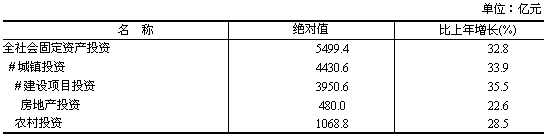 固定資產(chǎn)投資平穩(wěn)較快增長。全社會(huì)固定資產(chǎn)投資完成5499.4億元,比上年增長32.8%。其中,城鎮(zhèn)固定資產(chǎn)投資4430.6億元,增長33.9%,增速比上年回落2.6個(gè)百分點(diǎn);農(nóng)村投資1068.8億元,增長28.5%。