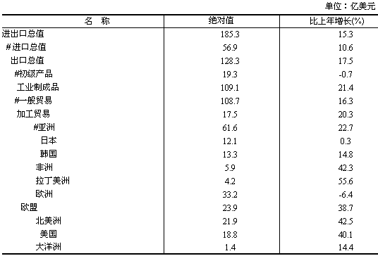 對外貿(mào)易較快增長。進(jìn)出口總值完成185.3億美元,比上年增長15.3%。其中出口總值128.3億美元,增長17.5%,增速比上年加快0.5個(gè)百分點(diǎn)。出口商品結(jié)構(gòu)進(jìn)一步優(yōu)化。工業(yè)制成品出口109.1億美元,增長21.4%,占出口總值的比重達(dá)85%,比上年提高2.7個(gè)百分點(diǎn);機(jī)電產(chǎn)品和高技術(shù)產(chǎn)品出口分別增長51.5%和1.1倍。初級產(chǎn)品出口得到抑制,出口額19.3億美元,下降0.7%。積極推進(jìn)出口市場多元化戰(zhàn)略,對世界主要貿(mào)易伙伴的貿(mào)易額均有不同程度的增長。