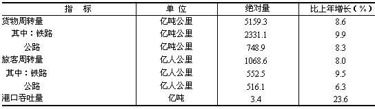 交通郵電業(yè)進(jìn)一步發(fā)展。全年交通運(yùn)輸、倉儲(chǔ)和郵政業(yè)實(shí)現(xiàn)增加值861.1億元,比上年增長10.9%。 交通運(yùn)輸業(yè)快速發(fā)展。全年貨物周轉(zhuǎn)量5159.3億噸公里,比上年增長8.6%;旅客周轉(zhuǎn)量1068.6億人公里,增長8.0%。港口吞吐量突破3億噸,達(dá)3.4億噸,增長23.6%。全省公路通車?yán)锍?43778公里(包括村路),其中高速公路2329公里,新建成高速公路194公里。新、改建農(nóng)村公路12953公里,總里程達(dá)125590公里。