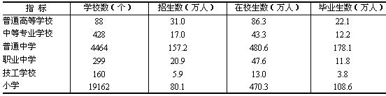 各級各類教育平穩(wěn)發(fā)展。研究生招生7712人,增長16.9%,在學(xué)研究生20088人,增長27.3%。普通高等學(xué)校88所,招生31.0萬人,比上年增長23.7%,在校學(xué)生86.3萬人,增長11.5%。中等專業(yè)學(xué)校在校生43.3萬人,普通中學(xué)在校學(xué)生480.6萬人,職業(yè)中學(xué)在校生47.6萬人,小學(xué)在校學(xué)生470.3萬人。學(xué)齡兒童入學(xué)率達(dá)99.4%。九年義務(wù)教育完成率達(dá)89.9%,比上年提高1.1個(gè)百分點(diǎn)。幼兒園在園幼兒133.6萬人。