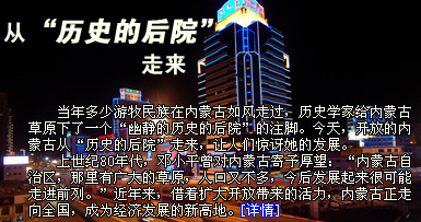 | 如果把一個(gè)地區(qū)的代表性產(chǎn)品、企業(yè)、行業(yè)看作是它的“名片”,我們?cè)趦?nèi)蒙古自治區(qū)出示的名片上可看到大草原、伊利、羊絨加工等字樣。[詳情] | | |