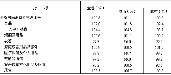 初步核算,全省實(shí)現(xiàn)生產(chǎn)總值7501.63億元,按可比價(jià)格計(jì)算,比上年增長(zhǎng)13.4%。其中,第一產(chǎn)業(yè)增加值885.23億元,增長(zhǎng)2.5%;第二產(chǎn)業(yè)增加值3736.08億元,增長(zhǎng)17.0%;第三產(chǎn)業(yè)增加值2880.32億元,增長(zhǎng)12.6%。人均地區(qū)生產(chǎn)總值21152元,比上年增長(zhǎng)12.7%。 產(chǎn)業(yè)結(jié)構(gòu)繼續(xù)調(diào)整。第一產(chǎn)業(yè)有所調(diào)減,第二產(chǎn)業(yè)繼續(xù)保持增勢(shì),第三產(chǎn)業(yè)發(fā)展穩(wěn)定。三次產(chǎn)業(yè)比例由上年的12.8:48.7:38.5調(diào)整為11.8:49.8:38.4。 居民消費(fèi)價(jià)格總水平比上年上漲0.8%(見(jiàn)表1),其中城市上漲1.1%,農(nóng)村上漲0.3%;消費(fèi)品價(jià)格上漲1.2%,服務(wù)價(jià)格下降0.5%。工業(yè)品出廠價(jià)格下降0.8%。原材料燃料動(dòng)力購(gòu)進(jìn)價(jià)格上漲3.9%。農(nóng)業(yè)生產(chǎn)資料價(jià)格上漲0.9%,比上年低7.2個(gè)百分點(diǎn)。