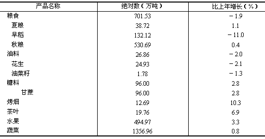 全省農(nóng)林牧漁業(yè)完成總產(chǎn)值1473.41億元,比上年增長(zhǎng)3.0%,增幅比上年回落1.7個(gè)百分點(diǎn)。 糧食種植面積2093.76萬(wàn)畝,比上年減少68.18萬(wàn)畝;煙葉種植面積103.69萬(wàn)畝,增加3.52萬(wàn)畝;蔬菜種植面積956.67萬(wàn)畝,增加8.59萬(wàn)畝;花卉種植面積15.86萬(wàn)畝,增加0.74萬(wàn)畝;油料種植面積182.21萬(wàn)畝,減少1.38萬(wàn)畝。糧食產(chǎn)量701.53萬(wàn)噸,比上年減產(chǎn)1.9%;煙葉產(chǎn)量12.84萬(wàn)噸,增產(chǎn)10.1%;油料產(chǎn)量26.86萬(wàn)噸,減產(chǎn)2.0%;蔬菜產(chǎn)量1356.96萬(wàn)噸,增產(chǎn)0.8%,水果產(chǎn)量494.97萬(wàn)噸,增產(chǎn)3.3%(見(jiàn)表2)。