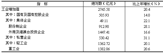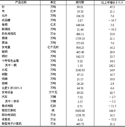 發(fā)電量904.25億千瓦小時(shí),增長(zhǎng)16.2%;原煤1759.18萬(wàn)噸,增長(zhǎng)21.1%。 黑色金屬冶煉及壓延加工業(yè)總產(chǎn)值比上年增長(zhǎng)32.9%,非金屬礦物制品工業(yè)增長(zhǎng)28.6%,化學(xué)原料及化學(xué)制品制造業(yè)增長(zhǎng)13.5%,有色金屬冶煉及壓延加工業(yè)增長(zhǎng)31.1%。主要原材料產(chǎn)品中,鋼材842.55萬(wàn)噸,增長(zhǎng)33.7%;粗鋼產(chǎn)量465.48萬(wàn)噸,增長(zhǎng)20.9%;水泥3343.93萬(wàn)噸,增長(zhǎng)24.9%;十種有色金屬增長(zhǎng)34.2%,硫酸、純堿、燒堿等主要化工產(chǎn)品增長(zhǎng)2.9%至16.7%。 通用設(shè)備制造業(yè)總產(chǎn)值比上年增長(zhǎng)27.6%,電氣機(jī)械及器材制造業(yè)增長(zhǎng)16.0%,交通運(yùn)輸設(shè)備制造業(yè)增長(zhǎng)24.8%。發(fā)電設(shè)備增長(zhǎng)42.7%;汽車產(chǎn)量7.32萬(wàn)輛,下降2.7%,其中轎車3.57萬(wàn)輛,下降5.3%。 高技術(shù)產(chǎn)業(yè)總產(chǎn)值比上年增長(zhǎng)26.4%。在高技術(shù)產(chǎn)業(yè)中,通信設(shè)備、計(jì)算機(jī)及其他電子設(shè)備制造業(yè)增長(zhǎng)29.6%,其中彩色電視機(jī)、程控交換機(jī)、移動(dòng)電話機(jī)、微型電子計(jì)算機(jī)等產(chǎn)品產(chǎn)量分別增長(zhǎng)16.5%至166.9%(工業(yè)主要產(chǎn)品產(chǎn)量見(jiàn)表4)。