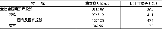 全省全社會(huì)固定資產(chǎn)投資3115.08億元,比上年增長(zhǎng)38.0%,其中,城鎮(zhèn)投資增長(zhǎng)41.1%,農(nóng)村投資增長(zhǎng)17.8%(見(jiàn)表5)。