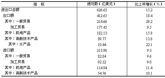 全省進(jìn)出口總額626.63億美元,比上年增長(zhǎng)15.2%。其中,出口412.65億美元,增長(zhǎng)18.4%;進(jìn)口213.98億美元,增長(zhǎng)9.3%(見(jiàn)表7)。進(jìn)出口相抵,順差198.67億美元,比上年增加45.94億美元。