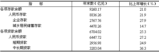 全省年末金融機(jī)構(gòu)本外幣各項(xiàng)存款余額9260.17億元,比上年增長(zhǎng)21.0%;全部金融機(jī)構(gòu)本外幣各項(xiàng)貸款余額6784.02億元,增長(zhǎng)25.3%(見(jiàn)表9)。 農(nóng)村合作金融機(jī)構(gòu)人民幣貸款余額543.67億元,比上年末增加108.36億元。金融機(jī)構(gòu)人民幣個(gè)人貸款余額1302.42億元,增長(zhǎng)48.9%。