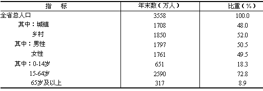 全省年末常住總?cè)丝?558萬(wàn)人(見(jiàn)表10),凈增人口23萬(wàn)人。出生人口42.56萬(wàn)人,出生率12.00‰;死亡人口20.39萬(wàn)人,死亡率5.75‰;自然增長(zhǎng)率6.25‰。