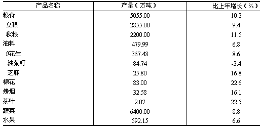 全年全省糧食種植面積13954.62萬畝,比上年增加224.50萬畝;其中,小麥種植面積7510.01萬畝,增加66.00萬畝,優(yōu)質(zhì)專用小麥種植面積占小麥種植面積的比重為61.4%。棉花種植面積1200.92萬畝,增加28.71萬畝。油料種植面積2326.50萬畝,減少82.25萬畝。蔬菜種植面積2597.70萬畝,增加203.92萬畝。 全年全省糧食產(chǎn)量5055.00萬噸,比上年增產(chǎn)10.3%;棉花產(chǎn)量83.00萬噸,增產(chǎn)22.6%;油料產(chǎn)量479.99萬噸,增產(chǎn)6.8%。全年肉類總產(chǎn)量737.00萬噸,增長7.0%;禽蛋產(chǎn)量400.82萬噸,增長6.8%;牛奶產(chǎn)量147.68萬噸,增長42.0%。全年水產(chǎn)品產(chǎn)量60.10萬噸,增長16.3%。