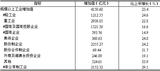 全年全部工業(yè)增加值6070.93億元,比上年增長18.7%,工業(yè)對經(jīng)濟增長的貢獻率為61.1%。其中,規(guī)模以上工業(yè)增加值4150.60億元,增長23.4%;產(chǎn)品銷售率98.5%,比上年提高0.1個百分點。