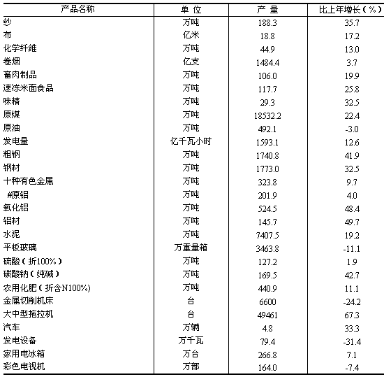 全省規(guī)模以上工業(yè)中,煤炭開采和洗選業(yè)實現(xiàn)增加值380.71億元,比上年增長20.6%;農(nóng)副食品加工業(yè)增加值270.72億元,增長25.1%;紡織業(yè)增加值147.31億元,增長21.3%;化學(xué)原料及化學(xué)制品制造業(yè)增加值230.08億元,增長26.8%;非金屬礦物制品業(yè)增加值391.45億元,增長26.9%;黑色金屬冶煉及壓延加工業(yè)增加值242.08億元,增長24.7%;有色金屬冶煉及壓延加工業(yè)增加值298.88億元,增長18.2%;通用設(shè)備制造業(yè)增加值150.78億元,增長27.9%;專用設(shè)備制造業(yè)增加值132.27億元,增長23.0%;電力、熱力的生產(chǎn)和供應(yīng)業(yè)增加值368.11億元,增長21.4%。 主要工業(yè)產(chǎn)品產(chǎn)量中,畜肉制品產(chǎn)量比上年增長19.9%,速凍米面食品增長25.8%,原煤增長22.4%,發(fā)電量增長12.6%,鋼材增長32.5%,鋁材增長49.7%,大中型拖拉機增長67.3%。