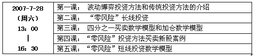 課程將詳細(xì)講解零風(fēng)險投資十大法則、經(jīng)典股市理論的零風(fēng)險操作策略、高拋低吸的1/4買賣法則、如何尋找最佳入市點(diǎn),以及適合不同類型股票的各種建倉及資金管理方法等。