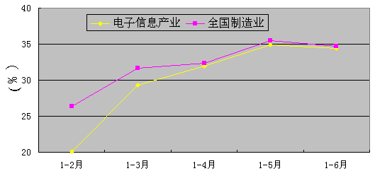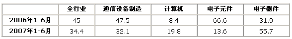 圖1 2007年1-6月電子信息產(chǎn)業(yè)與全國制造業(yè)累計(jì)完成投資增速對(duì)比情況(%)