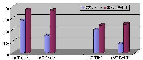 2006-2007年上半年全行業(yè)及電子元器件行業(yè)內(nèi)港澳臺(tái)和其他外商投資企業(yè)投資變化情況