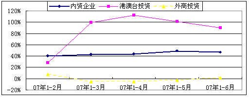 5、外商投資增長由負(fù)轉(zhuǎn)正,港澳臺(tái)企業(yè)投資高漲,私營企業(yè)投資保持活躍 隨著我國對(duì)高耗能、高污染投資項(xiàng)目的限制,企業(yè)所得稅內(nèi)外合一實(shí)施日期的臨近,再加上其他發(fā)展中國家如印度、越南等對(duì)引入外資的競爭,今年前5個(gè)月我國電子信息產(chǎn)業(yè)外資企業(yè)(港澳臺(tái)企業(yè)除外)的投資一直處于負(fù)增長狀態(tài),進(jìn)入6月份后,外資企業(yè)投資開始有所增長,累計(jì)完成投資371.2億元,同比增長1.3%。其中,移動(dòng)通信及終端設(shè)備、計(jì)算機(jī)整機(jī)、集成電路、電子元件及組件幾個(gè)行業(yè)的外商投資仍處于負(fù)增長狀態(tài),移動(dòng)通信及終端設(shè)備行業(yè)降幅高達(dá)54%。 港澳臺(tái)企業(yè)投資增速今年以來一直保持迅猛增長,1-6月累計(jì)完成投資279.1億元,同比增長89.7%,增幅比去年同期高78個(gè)百分點(diǎn)。港澳臺(tái)企業(yè)的投資主要集中在移動(dòng)通信及終端設(shè)備、集成電路及光電子器件行業(yè)。 港澳臺(tái)企業(yè)與外商投資的不同發(fā)展趨勢(shì),引起了我國電子信息產(chǎn)業(yè)投資結(jié)構(gòu)的變化。1-6月三資企業(yè)在我國大陸的總投資中,