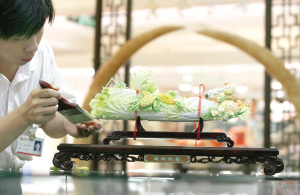昨天(13日),“中國(guó)工藝美術(shù)大師象牙雕刻作品展”在王府井工美大廈的“京城象牙第一店”內(nèi)拉開帷幕。此次展出匯集了孫森、時(shí)金蘭、柴慈繼等國(guó)家級(jí)牙雕大師的40多件作品,其中牙雕大師陳乃昌的牙雕彩活“蟈蟈白菜”堪稱一絕。這件作品重2110克,白菜和蟈蟈活靈活現(xiàn),幾能亂真。圖為工作人員細(xì)心地為牙雕彩活“蟈蟈白菜”除塵。