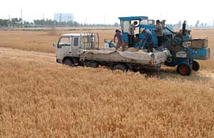 鄭州郊區(qū)農(nóng)民收打小麥。攝影/本報記者