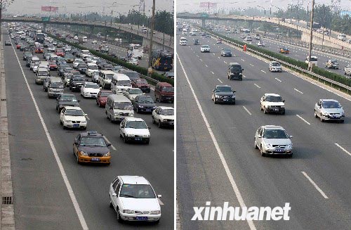左圖和右圖分別為8月16日8時(shí)許和17日8時(shí)許在北京東四環(huán)小武基橋拍攝的車(chē)流。