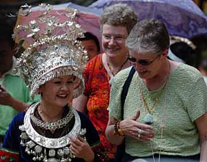 | 兩名外國(guó)旅游者在凱里市南花村同當(dāng)?shù)孛缱鍕D女交流。攝影/楊俊江 | “最具吸引力的旅游勝地”