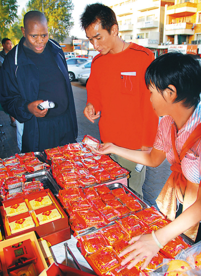 中秋節(jié)臨近,南非最大城市約翰內(nèi)斯堡的一些面向華人顧客的商店紛紛推出各式月餅。圖為9月15日,在該市西羅町唐人街,一名南非顧客(左)在選購月餅。