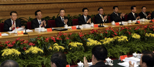 | 10月17日,中國(guó)共產(chǎn)黨第十七次全國(guó)代表大會(huì)主席團(tuán)在北京人民大會(huì)堂舉行第二次會(huì)議。胡錦濤、吳邦國(guó)、溫家寶、賈慶林、曾慶紅、吳官正、李長(zhǎng)春、羅干等出席會(huì)議。 |