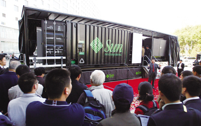 10月22日,全球第一個(gè)移動式、虛擬化的數(shù)據(jù)中心——Sun Blackbox,經(jīng)過美國、加拿大、英國、俄羅斯和新加坡巡游后,來到北京。圖為北京市電信、金融、能源、教育等行業(yè)的眾多人士爭睹這個(gè)以標(biāo)準(zhǔn)集裝箱構(gòu)建、可靈活移動又經(jīng)濟(jì)環(huán)保的模塊虛擬化數(shù)據(jù)中心。