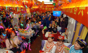 圖為在T69次列車(chē)上舉辦的“春節(jié)晚會(huì)”現(xiàn)場(chǎng)(2007年2月17日攝)。2月17日除夕夜,在北京開(kāi)往烏魯木齊的T69次列車(chē)上舉辦了一場(chǎng)別開(kāi)生面的列車(chē)“春晚”。列車(chē)乘務(wù)員自編自演節(jié)目,與旅客聯(lián)歡,共除舊歲! ⌒氯A社記者